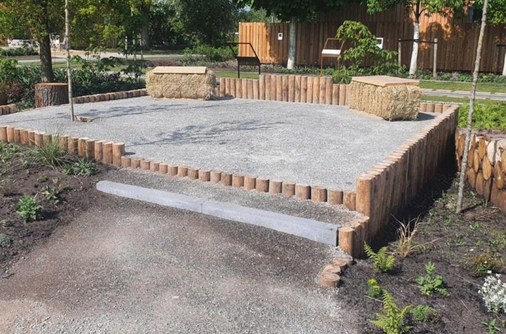 - Kern der Handlung: KoMex Antraciet, Bänke, Stützmauern (Holz) und Springbrunnen