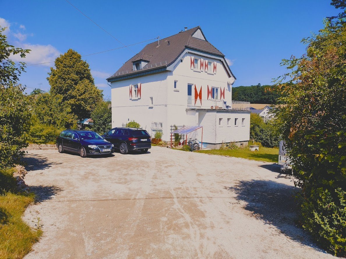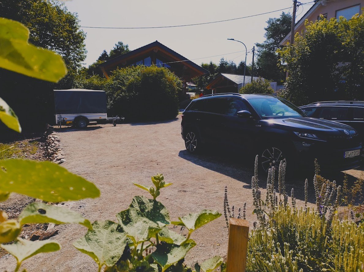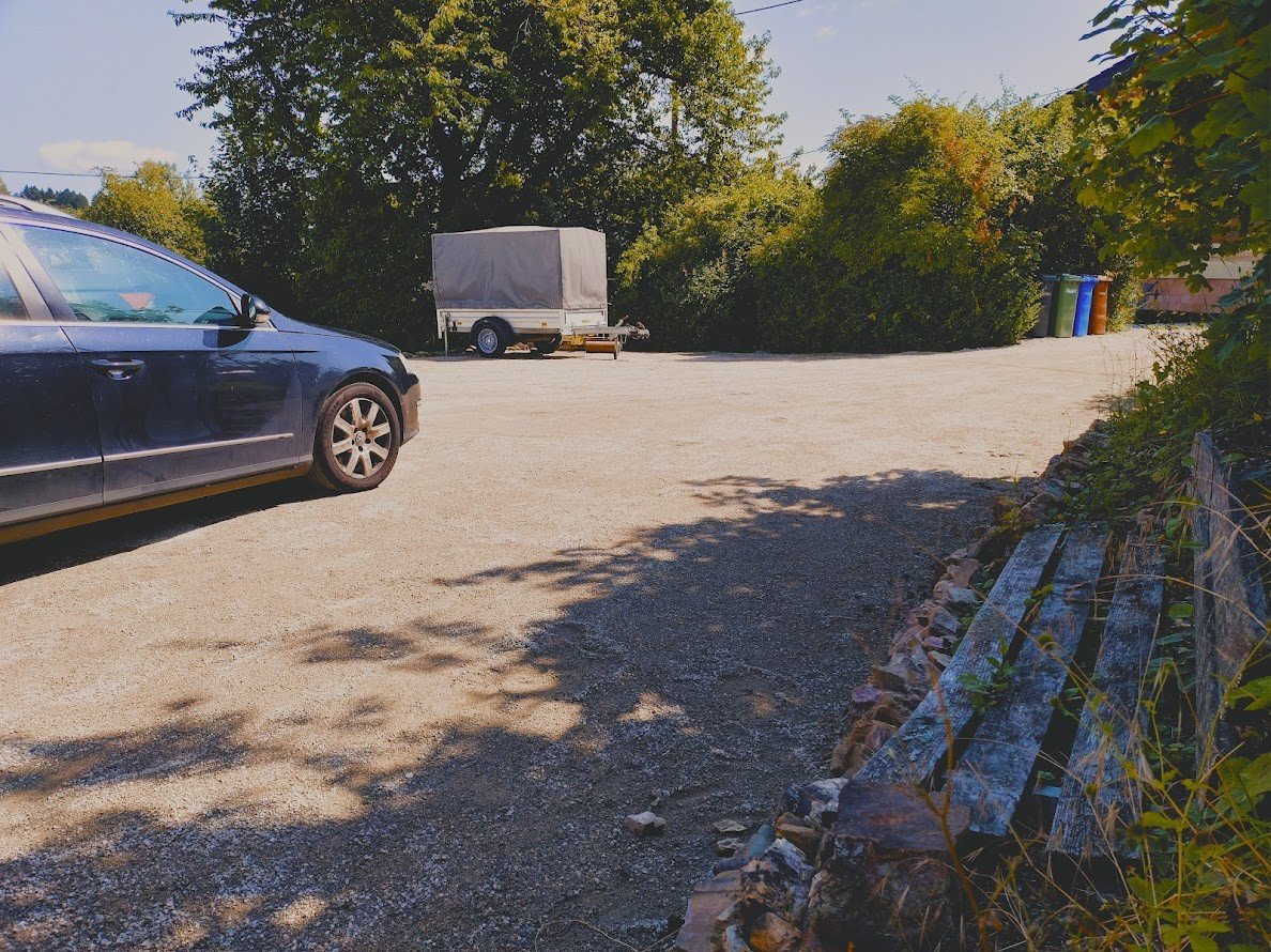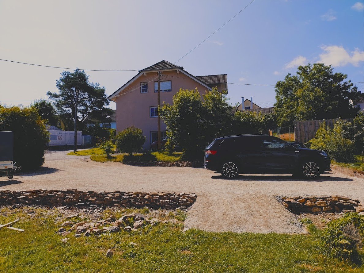La maison, une ancienne école de village située en lisière, offre une belle vue sur la forêt. Construite il y a plus de 100 ans sur un grand terrain en pente, l’ancienne salle des professeurs est aujourd’hui transformée en logement AirBNB. Les hôtes peuvent se garer directement devant la maison, sur une aire d’environ 270 m², où la couche en KoMex BIO a été posée en juin 2025.
