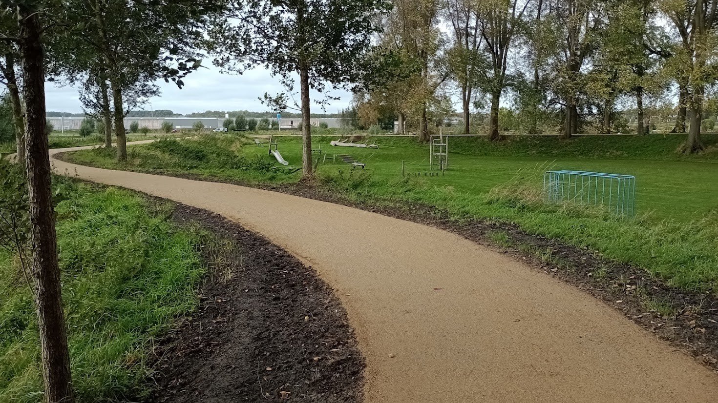 Als Ersatz wurde KoMex Gelb gewählt, ein wasserdurchlässiger Halbbelag mit einer warmen, natürlichen gelben Farbe. Diese Farbe passt hervorragend zur umgebenden Landschaft und zur historischen Deichstruktur, wodurch der Weg optisch weniger dominant ist als Asphalt. Gleichzeitig entsteht ein ruhiges und natürliches Bild, das zum Charakter des Oude Koedijk passt.