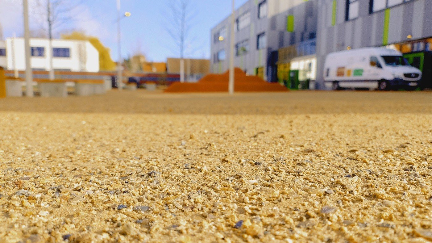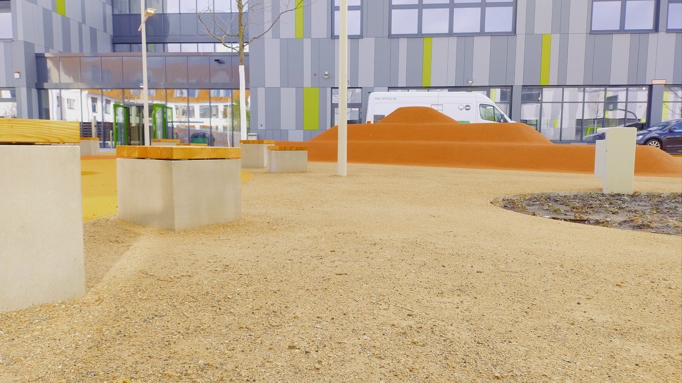Nach den Osterferien 2026 erfolgte die Einweihung der neuen Peter-Härtling-Schule (eine Förderschule des Kreises Soest). In Februar und März wurde an unterschiedliche Stellen das Koers wassergebundene Wegedeckenmaterial KoMex Gelb eingebaut.