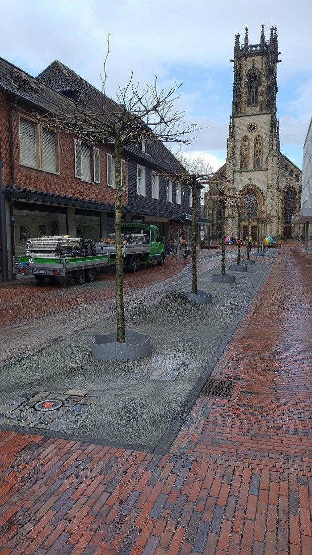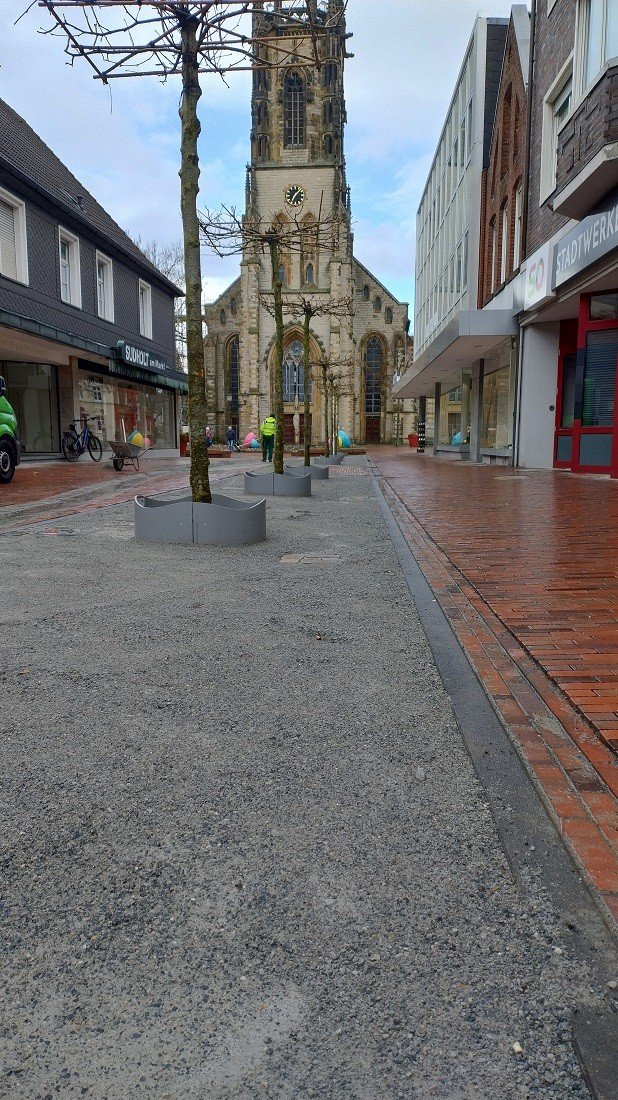 De Herrenstraße dient nu als een uitnodigende entree naar het centrum van Oelde. Om de nieuw geplante bomen optimale groeiomstandigheden te bieden in de stedelijke ruimte en tegelijkertijd begaanbare, stabiele vlakken voor voetgangers te creëren, is gekozen voor de halfverharding DurEko-mix als toplaag voor de boomspiegels.